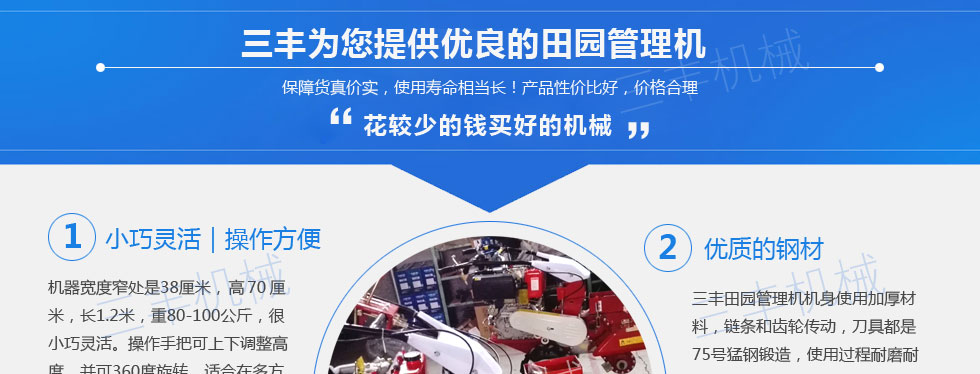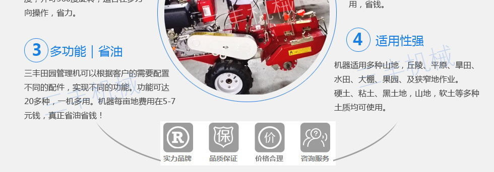 服務(wù)周到,不多花一分錢,細(xì)致周到的服務(wù)和可靠的信譽(yù)贏得客戶。田園管理機(jī)產(chǎn)品的各項(xiàng)指標(biāo)已 達(dá)到國(guó)內(nèi)外同類產(chǎn)品的先進(jìn)水平。